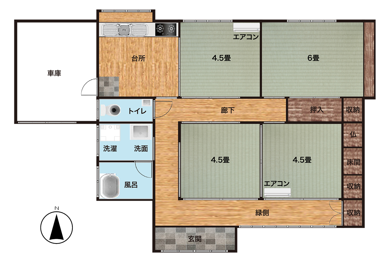 和室4.5畳×3、和室6畳、台所、風呂、トイレ |