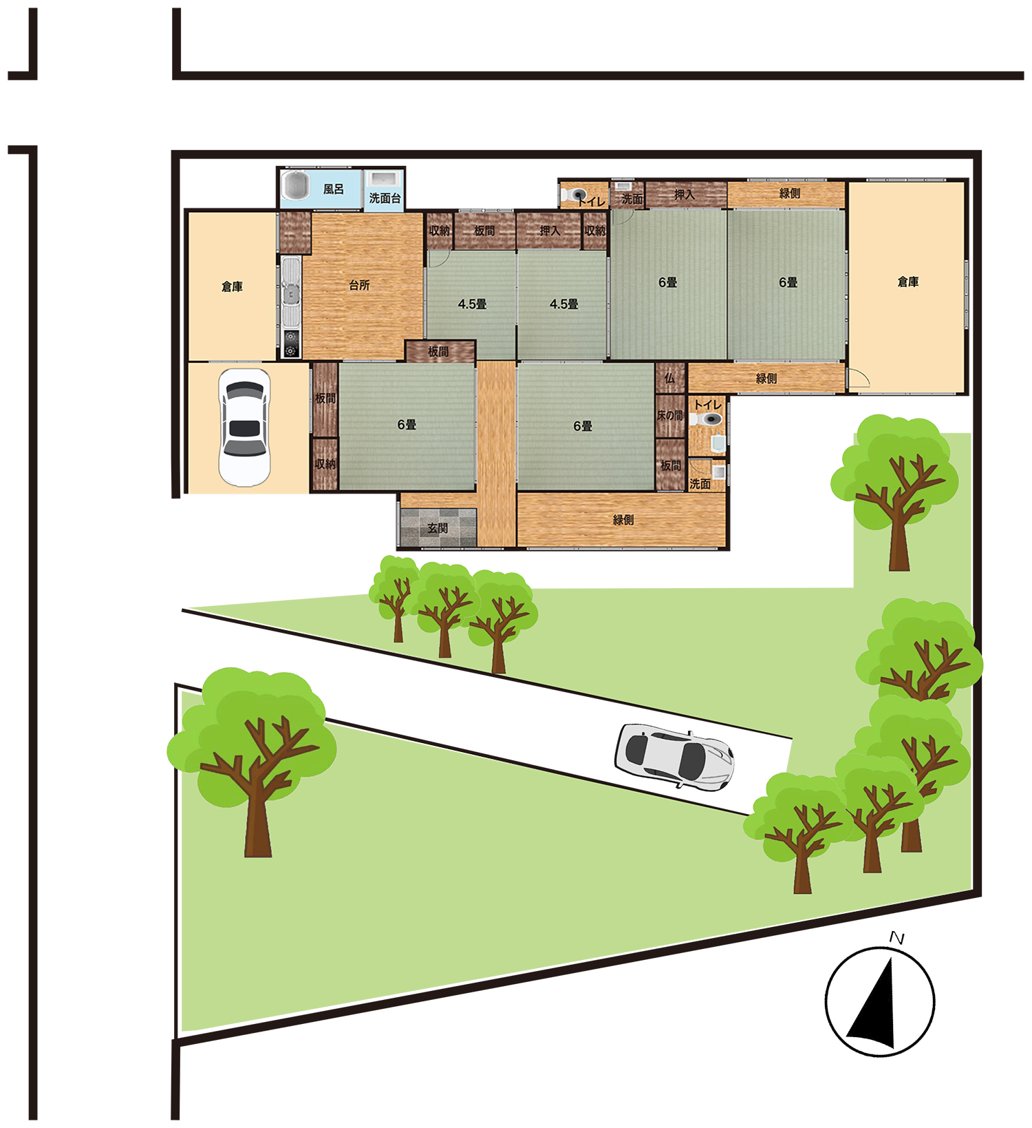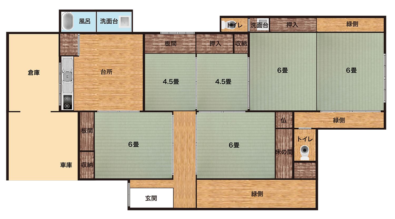 台所、風呂、トイレ、和室6畳×4、和室4.5畳×2 |