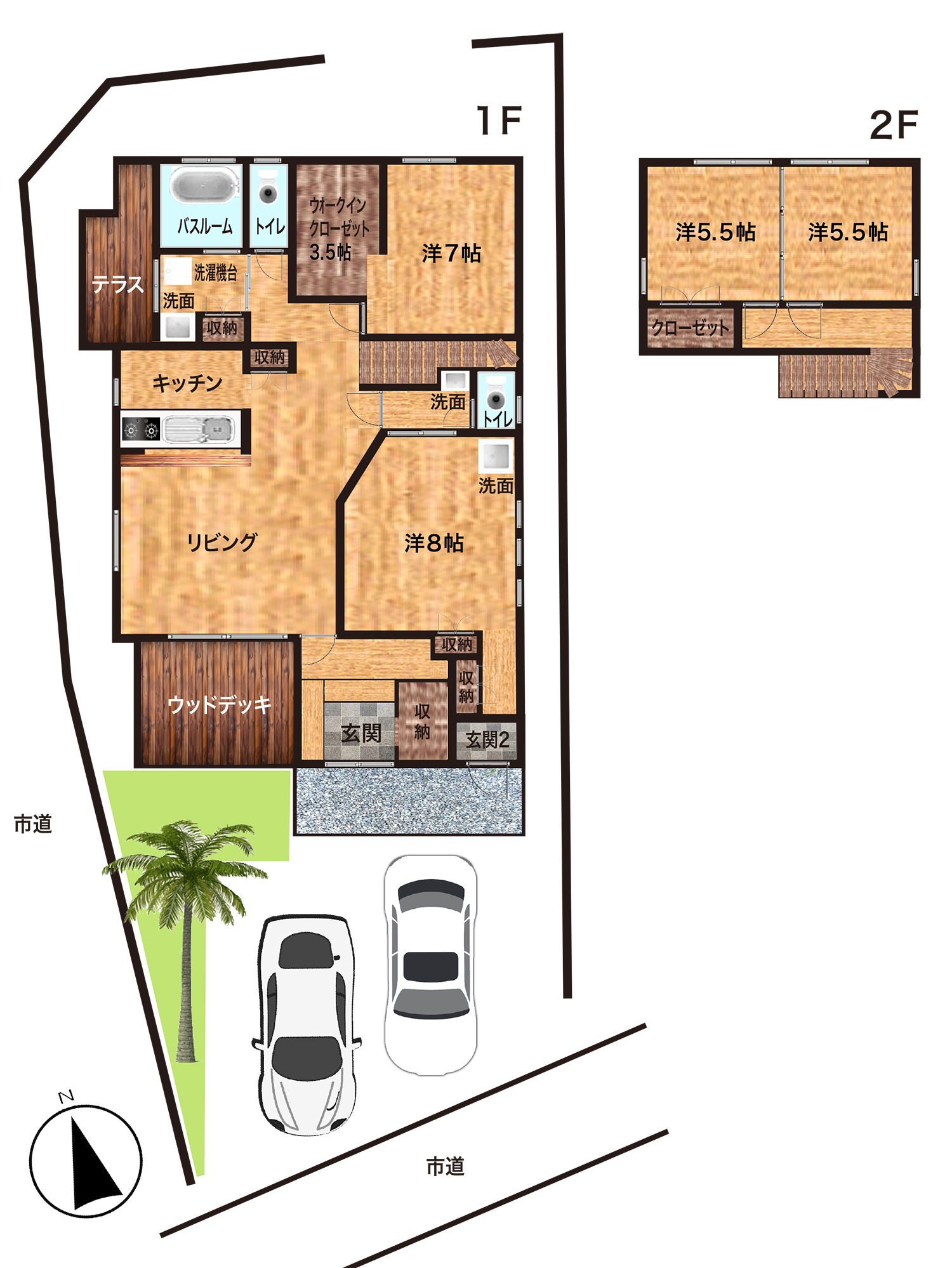 1階 洋室7帖、洋室8帖、LDK19帖、クローゼット3.5帖、台所、トイレ、風呂 2階 洋室5.5帖×2 |