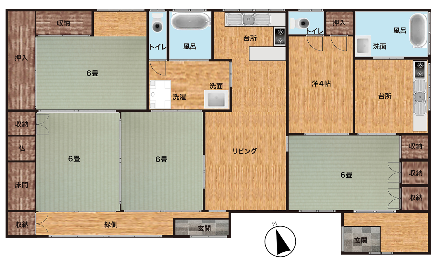 和室6畳×4、洋室4帖、LDK、台所×2、トイレ×2、風呂×2 |